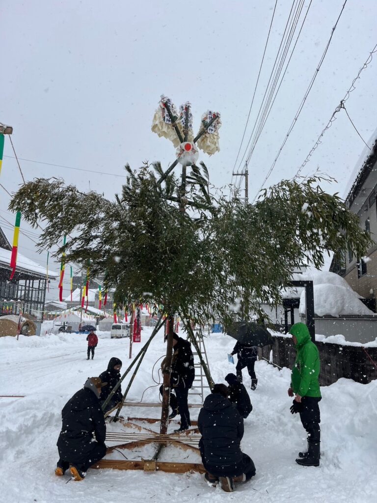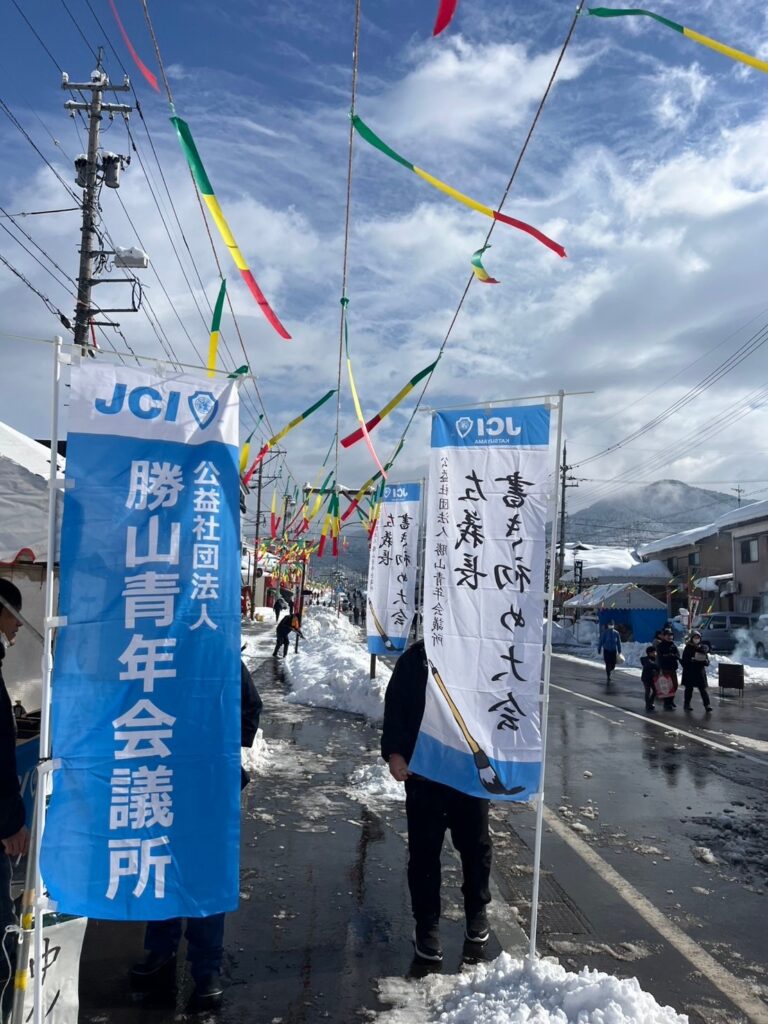 2月例会では例年恒例の勝山左義長祭に参加させていただき、書き初めブースと炎餅の販売をいたしました。