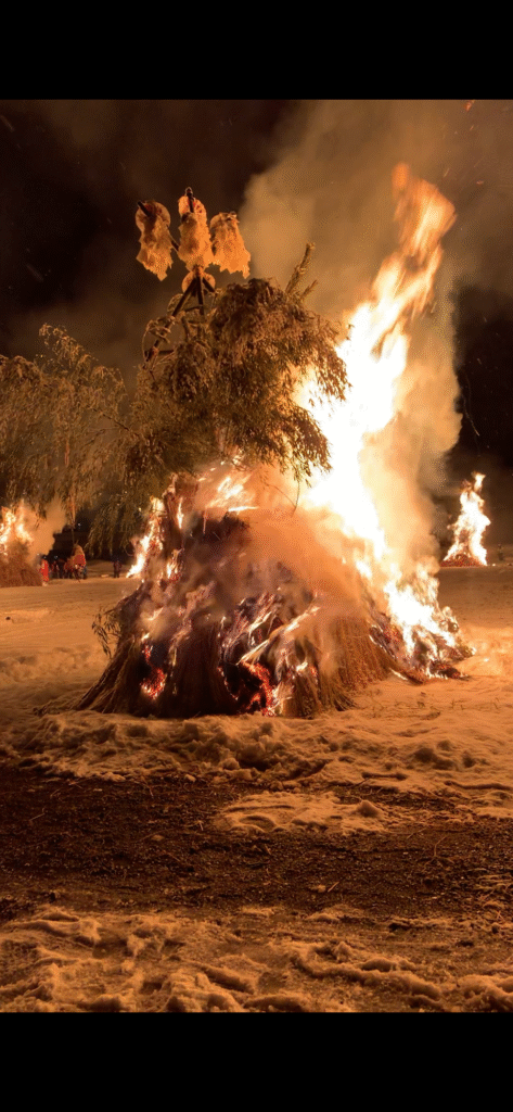 御神体も作成させていただき最後にどんど焼きにて、書いていただいた習字と共に燃やさせていただきました。